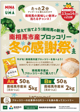 南相馬市産の冬季ブロッコリーをPRする販売キャンペーン「冬の感謝祭」が、12月13日(土)・14日(日)の2日間、イオングループ各店舗で実施されます。今回は、春のキャンペーンで好評だった“新米プレゼント企画”も引き続き実施され、南相馬市産ブロッコリーを購入すると応募できる仕組みです。