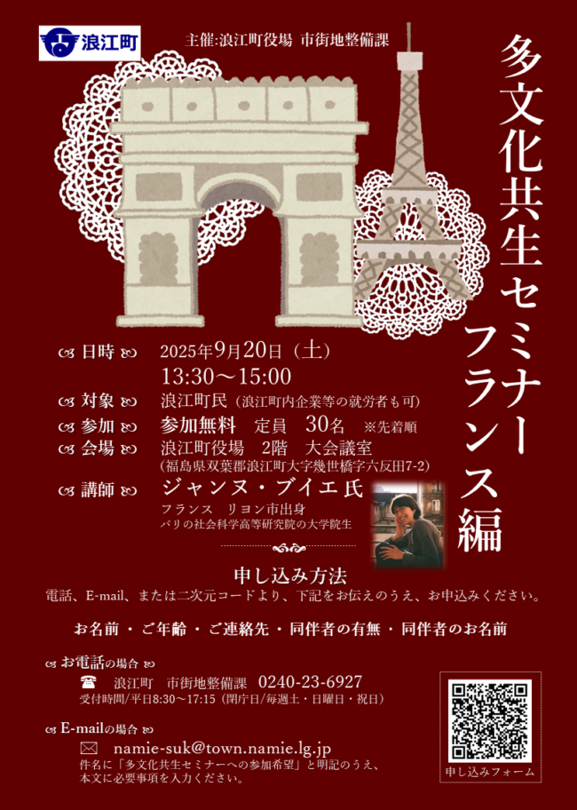 浪江町では、多文化共生への理解を深めることを目的とした「多文化共生セミナー(フランス編)」を開催します。福島国際研究教育機構(F-REI)の立地を受け、今後外国人の移住・定住が見込まれるなか、日本と外国の文化や生活習慣の違いを学び、「誰もがすみやすいまちづくり」について考える機会となります