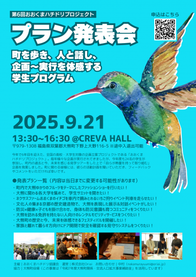 学生たちが大熊町を訪れ、町の復興や課題解決に向けたアイデアを発表する「おおくまハチドリプロジェクトプラン発表会」が開催されます。