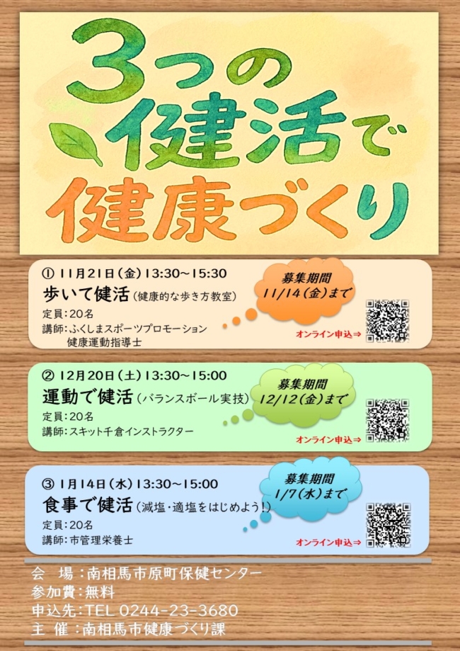 南相馬市では、「歩く」「運動」「食事」をテーマにした健康講座を開催します。健康づくりに関する情報を得られるだけでなく、その必要性や楽しさを感じながら、日常生活での実践や継続につながる機会となるでしょう。
