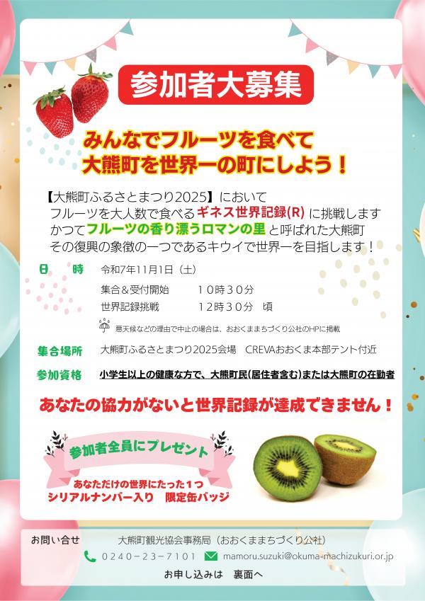 ふるさとまつり会場では、町民・在勤者・応援者の皆さんと一緒に「フルーツを大人数で食べるギネス世界記録」に挑戦します。かつて「フルーツの香り漂うロマンの里」と呼ばれた大熊町の復興の象徴として、キウイをテーマにしたチャレンジです。