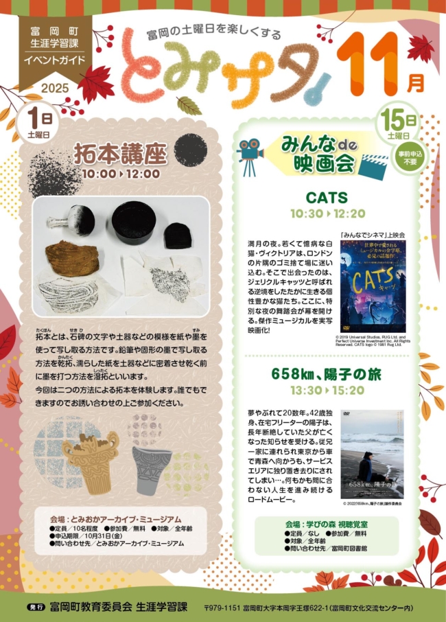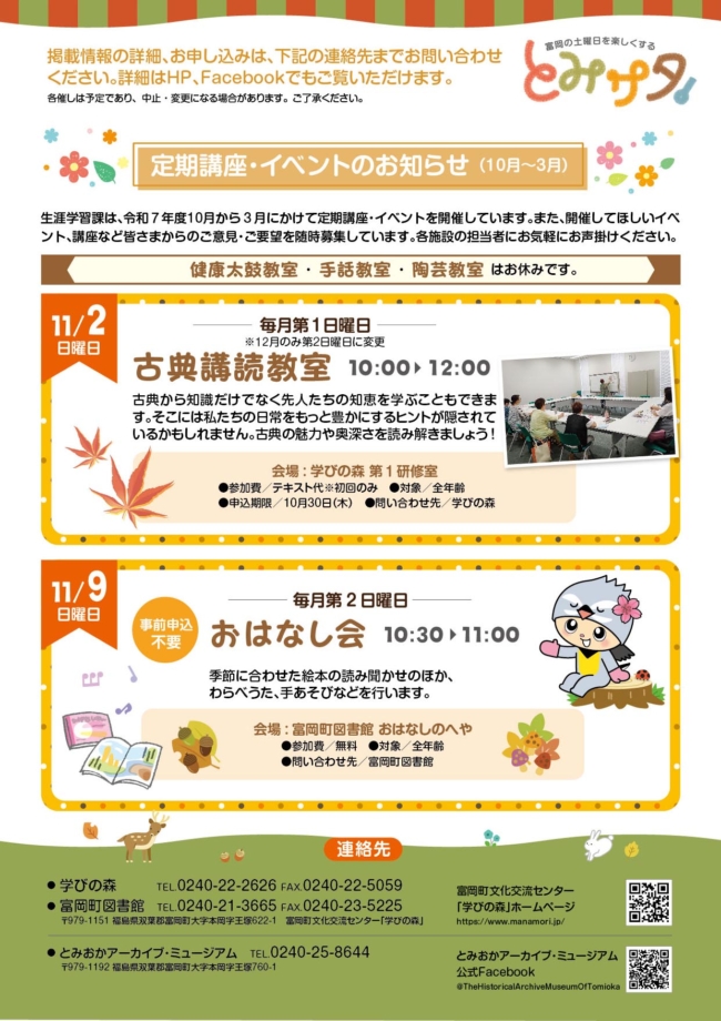 富岡町教育委員会生涯学習課では、地域の皆さんが楽しみながら学べる講座やイベントを「学びの森」や「とみおかアーカイブ・ミュージアム」などで定期的に開催しています。11月は、ものづくり体験や映画上映など、充実したプログラムがそろいました。