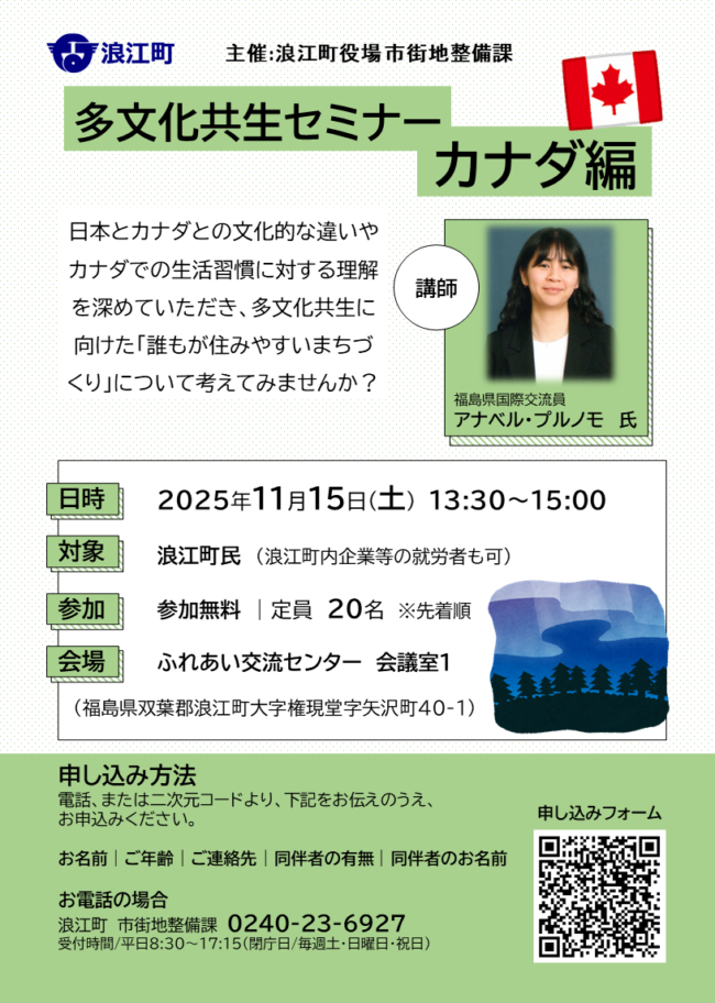講師を務めるのは、福島県国際交流員のアナベル・プルノモ氏。カナダ出身のプルノモ氏が、同国の地理や歴史、文化、生活習慣について紹介します。日本との文化的な違いを知ることで、浪江町における多文化共生への理解を深めるきっかけとなりそうです。