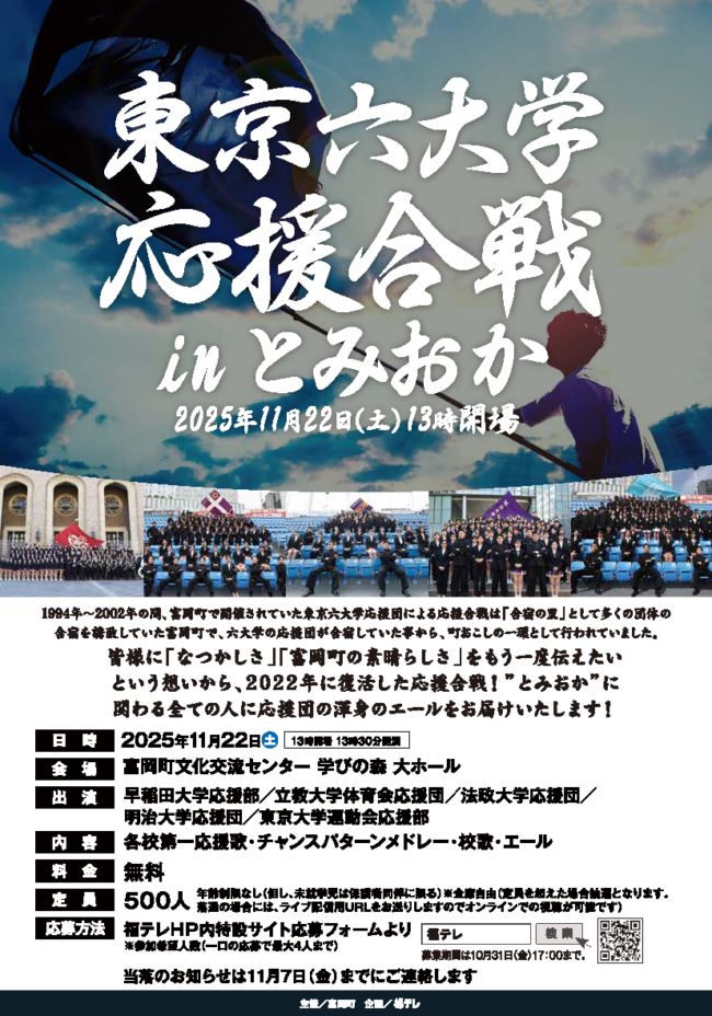 「東京六大学応援合戦inとみおか2025」が、11月22日(土)に富岡町文化交流センター「学びの森」で開催されます。“とみおか”に関わる人々にエールを届ける、名物イベントです。