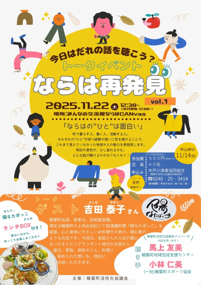 楢葉町で暮らす人・働く人・活動する人の“想い”に耳を傾け、地域の魅力を再発見するトークイベント「ならは再発見」vol.1 が開催されます。ゲストの人生や経験に触れる、心あたたまるひとときを過ごしてみませんか。