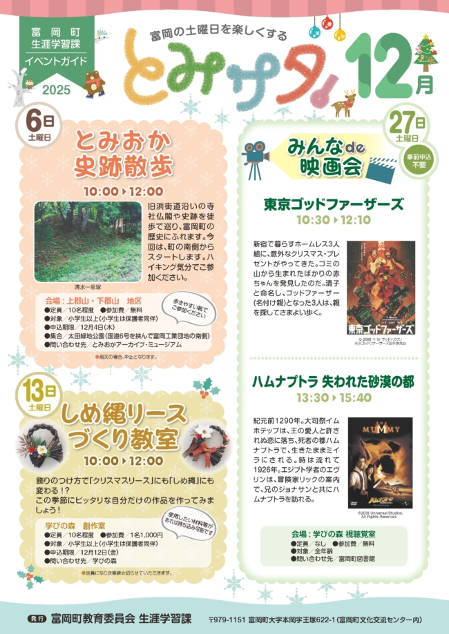 富岡町生涯学習課では、学びの森、図書館、とみおかアーカイブ・ミュージアムを会場に、地域の方が気軽に参加できる生涯学習講座を開催しています。12月の「とみサタ!」は、歴史散策やものづくり、映画上映会など、世代を問わず楽しめる内容です。