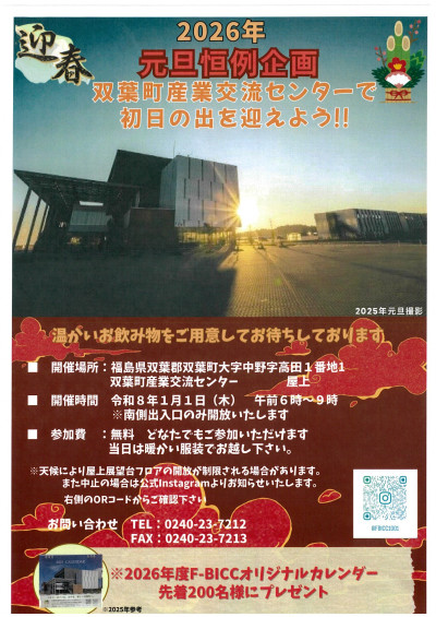 会場となるのは、双葉町産業交流センターF-BICCの屋上。朝の澄んだ空気の中、初日の出を眺めながら新しい一年のスタートを切ることができます。当日は、来場者に向けて温かい飲み物の提供も予定されており、寒い元日の朝でも安心して参加できます。